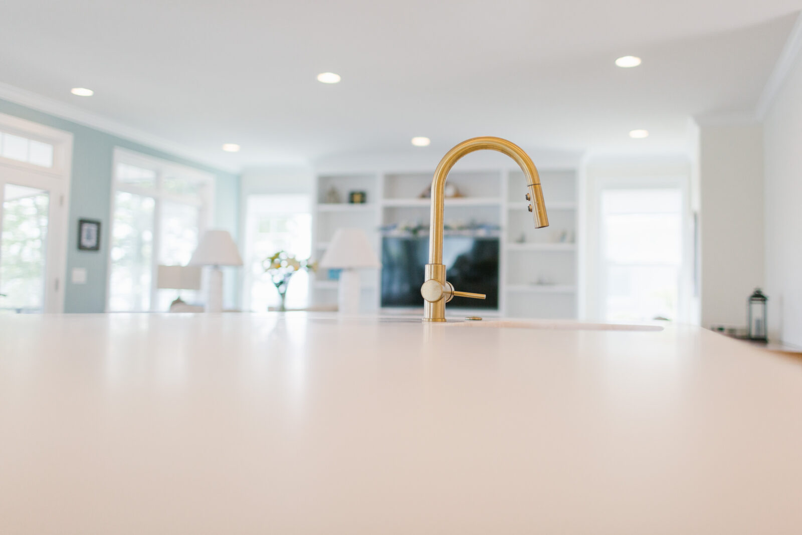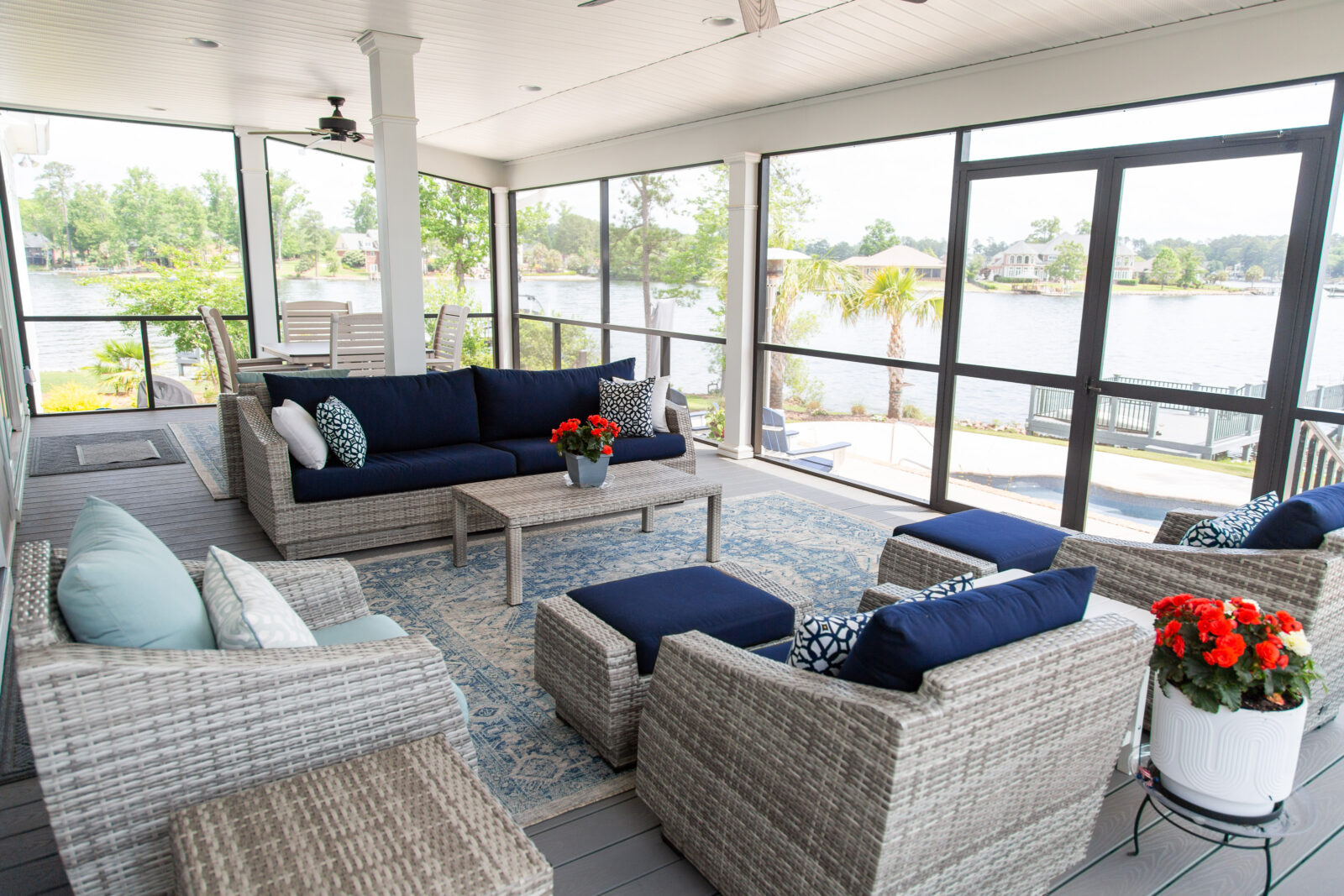 The heart of this transitional-style home is its kitchen, designed without corners per the client’s request to maximize functionality. The kitchen anchors a spacious great room, flowing into a dining area and a large screened porch overlooking the pool and lake, creating an inviting extension of the living space. To the right, a cozy living area complements the dining space, while to the left, a sunroom—divided by a stylish wall with a bar facing the dining area and a fireplace toward the sunroom—offers a secondary lounging area.